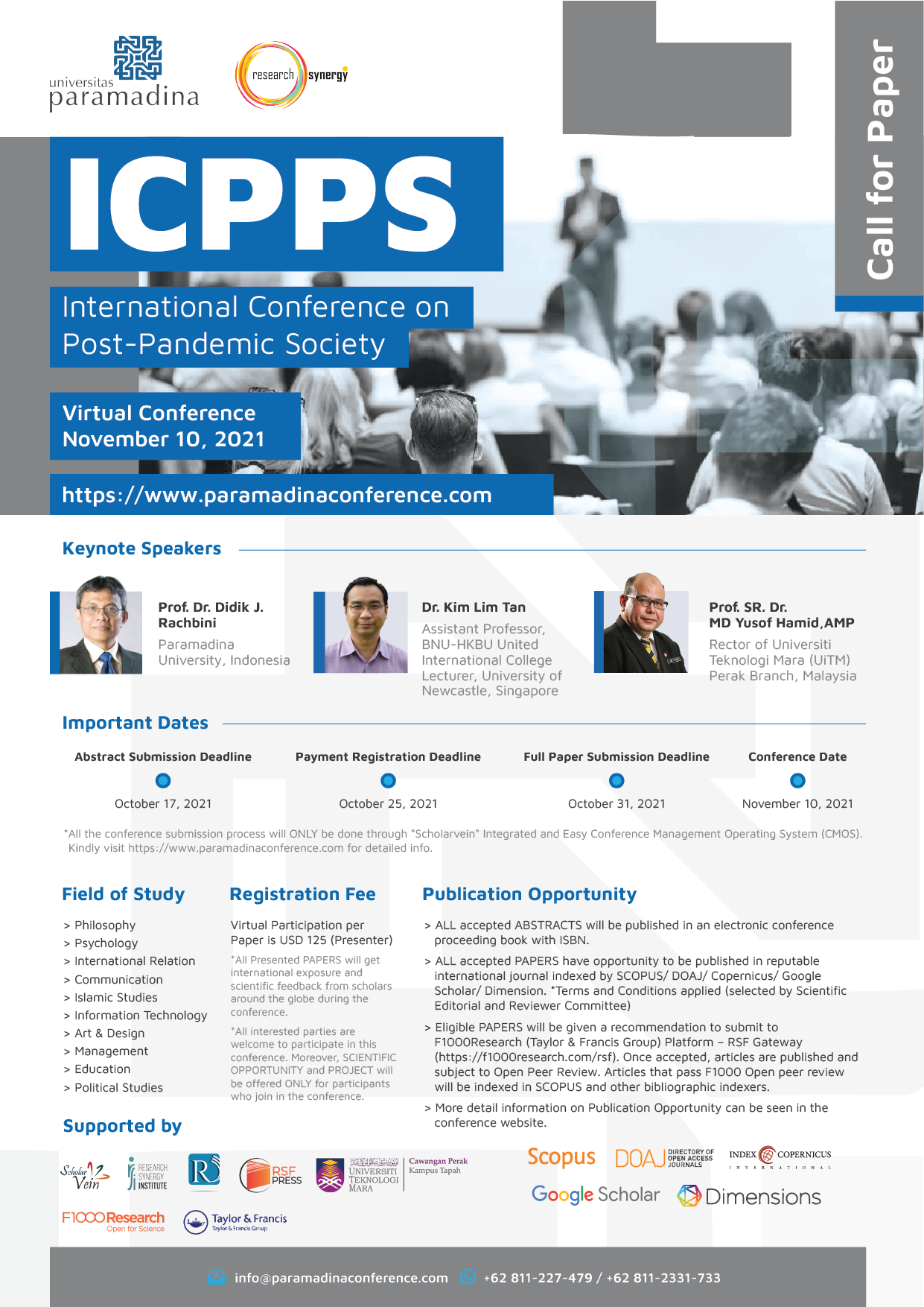 Paramadina University and Research Synergy Foundation (RSF) proudly invite all scholars, practitioners, and researchers to participate in the “International Conference on Post-Pandemic Society (ICPPS)”.